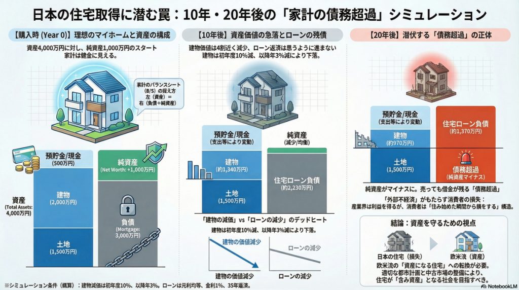 日本の住宅取得は、都内の住宅地などほんの一部の例外を除き、住宅ローンを組んで住宅を購入すると、家計のバランスシートは「債務超過状態」になるケースがほとんど。中古住宅の売買が少ないから表面化していないが、老後に十分なキャッシュ化が出来ない古家の問題が、老後資金の不安や空き家増加などの社会問題に繋がっている。私の過去のコラムを生成AIに読み込ませ、NotebookLMで生成したインフォグラフィックス