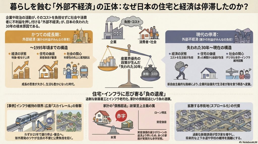 前回のコラム第193話『外部不経済の容認が”失われた30年”の正体か?』をNotebookLMに読み込ませて生成したインフォグラフィックス。今や、住宅建築の不安や住宅会社の評価も、生成AIが答えてくれる時代になりつつある。営業マンは知識や経験だけでなく、人間でなければ出来ない信頼感や感動を与えるだけの人間力を磨くことが求められている。