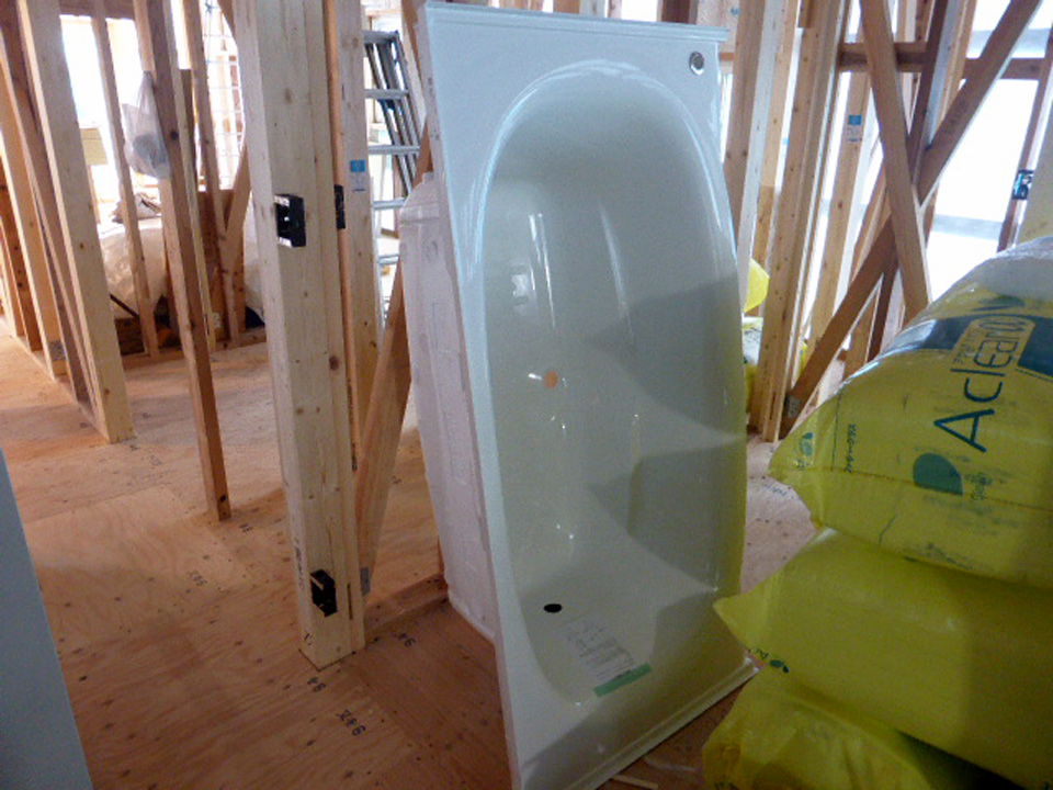 建築現場に搬入されたユニットバスの浴槽。今や多くの住宅建材が、石油由来の樹脂・アクリル・プラスティック・塩化ビニール製で、断熱材や梱包材もナフサの輸入が停止されれば製造もストップする。例えば工事の前半で据え付けるユニットバスが入らないだけで、次の内装仕上げ工程に進められず、現場はストップしてしまう。