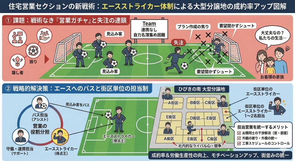 プロスポーツの世界、特に球技では、選手の能力や適正に応じて、守備や攻撃の役割を分解・訓練し、得点機会を増やすようなエースストライカー・主砲を育てる。ビジネスの世界も同じで、より営業効率の高い戦術と人材育成によって、契約率を高めてお客様満足度も向上させるという教育訓練とスキームづくりが必要だ。